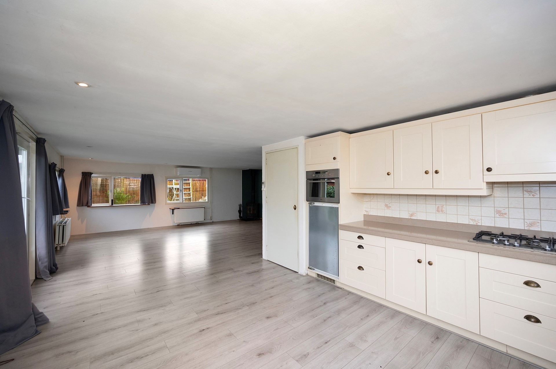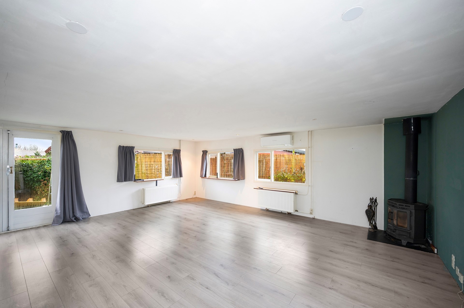 Riante woonkamer met sfeer, op de koude dagen genieten van warmtestralen van de houtkachel en zorgt de airconditioning voor verkoeling tijdens zomerse dagen.