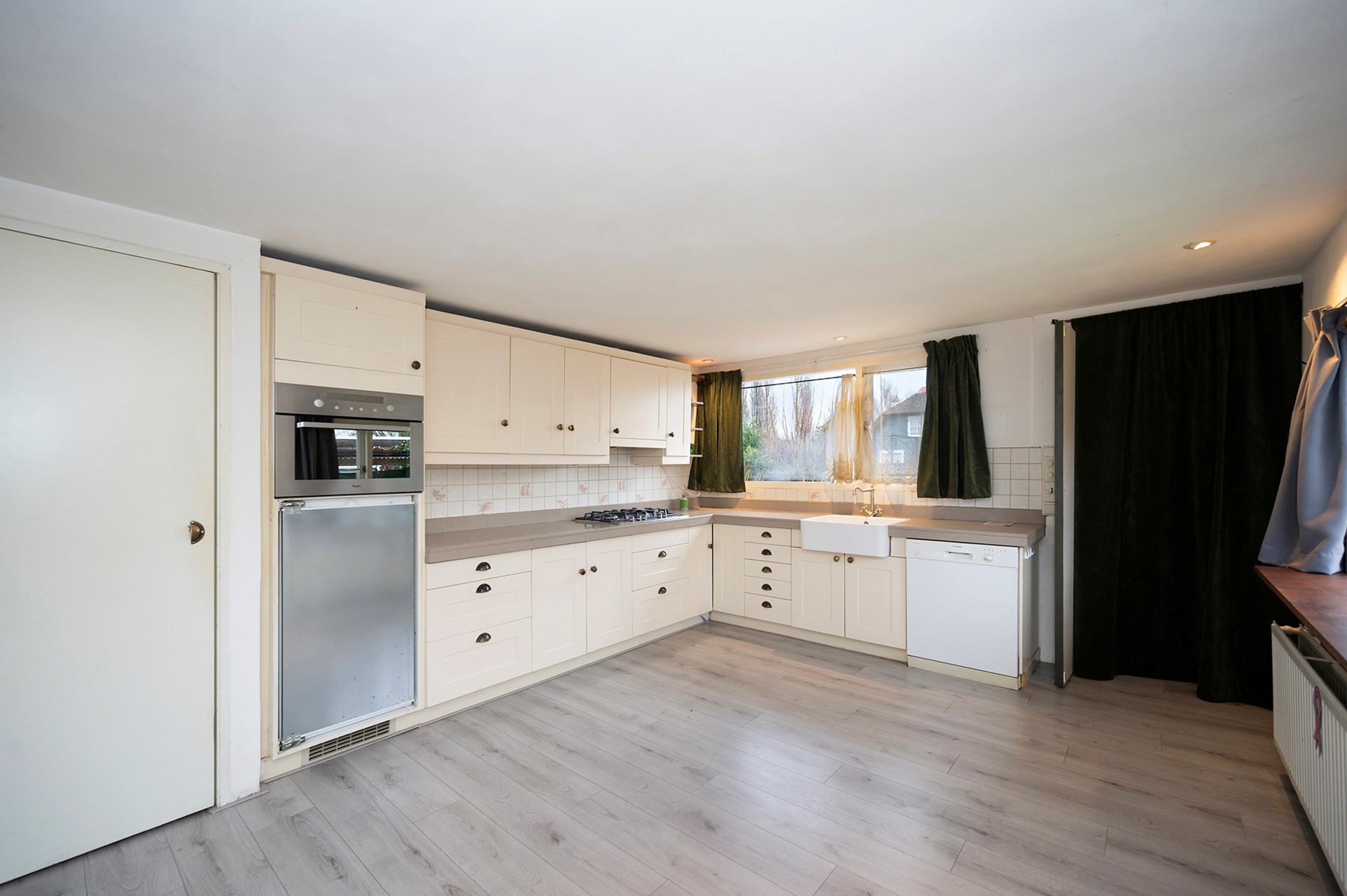 Een open keuken met veel kastruimte en inbouwapparatuur met o.a.: koelkast, 5-pits gaskookplaat, afzuigkap, combimagnetronoven én een vaatwasser.