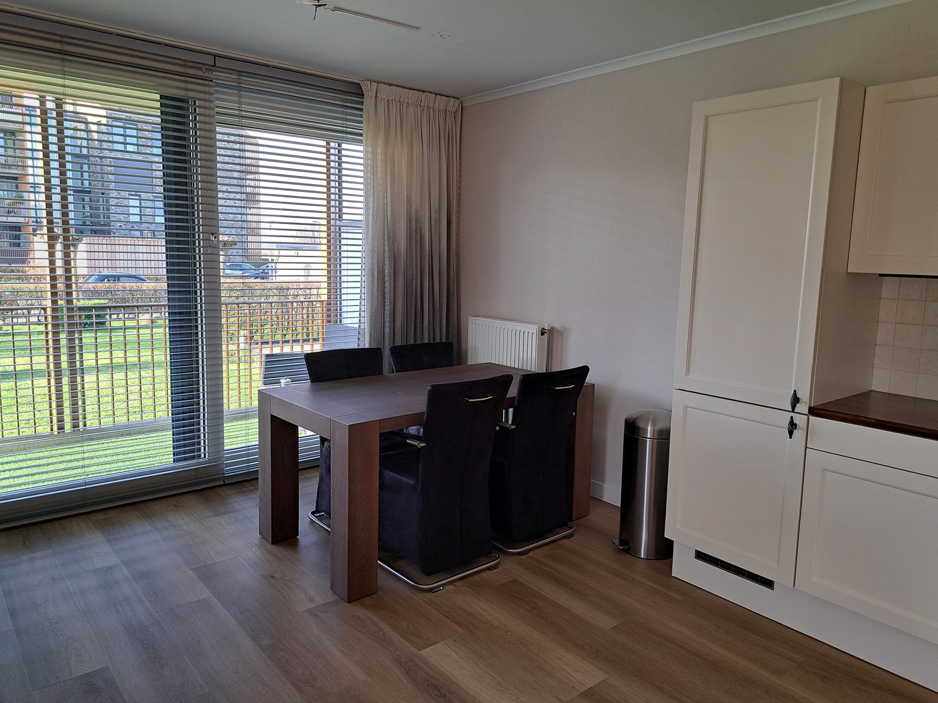 Royale entree/hal, toilet, ruime ouderslaapkamer, ruime badkamer met douchecabine en wastafel, kleine slaap/werkkamer, berging met cv-combiketel (2011), M.V.-box en aansluitpunten voor wasmachine/droger, riante, lichte living, moderne open keuken met 4-pits gaskookplaat, afzuigkap, combimagnetronoven, koelkast en vriesladenkast, entree via schuifpui naar ruim "groen" terras over de gehele breedte (ca. 14 m²).