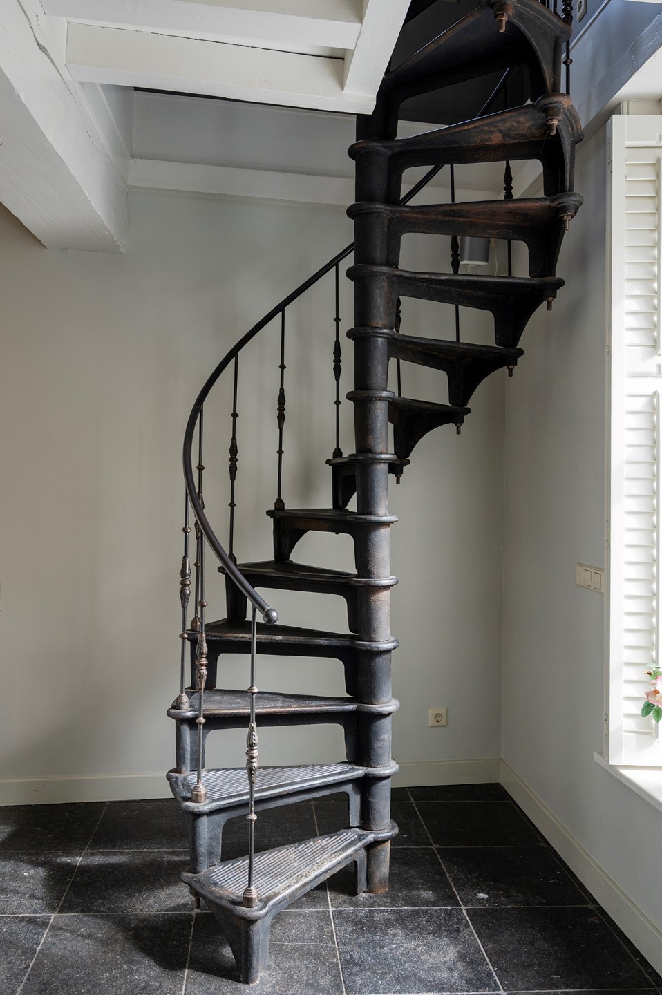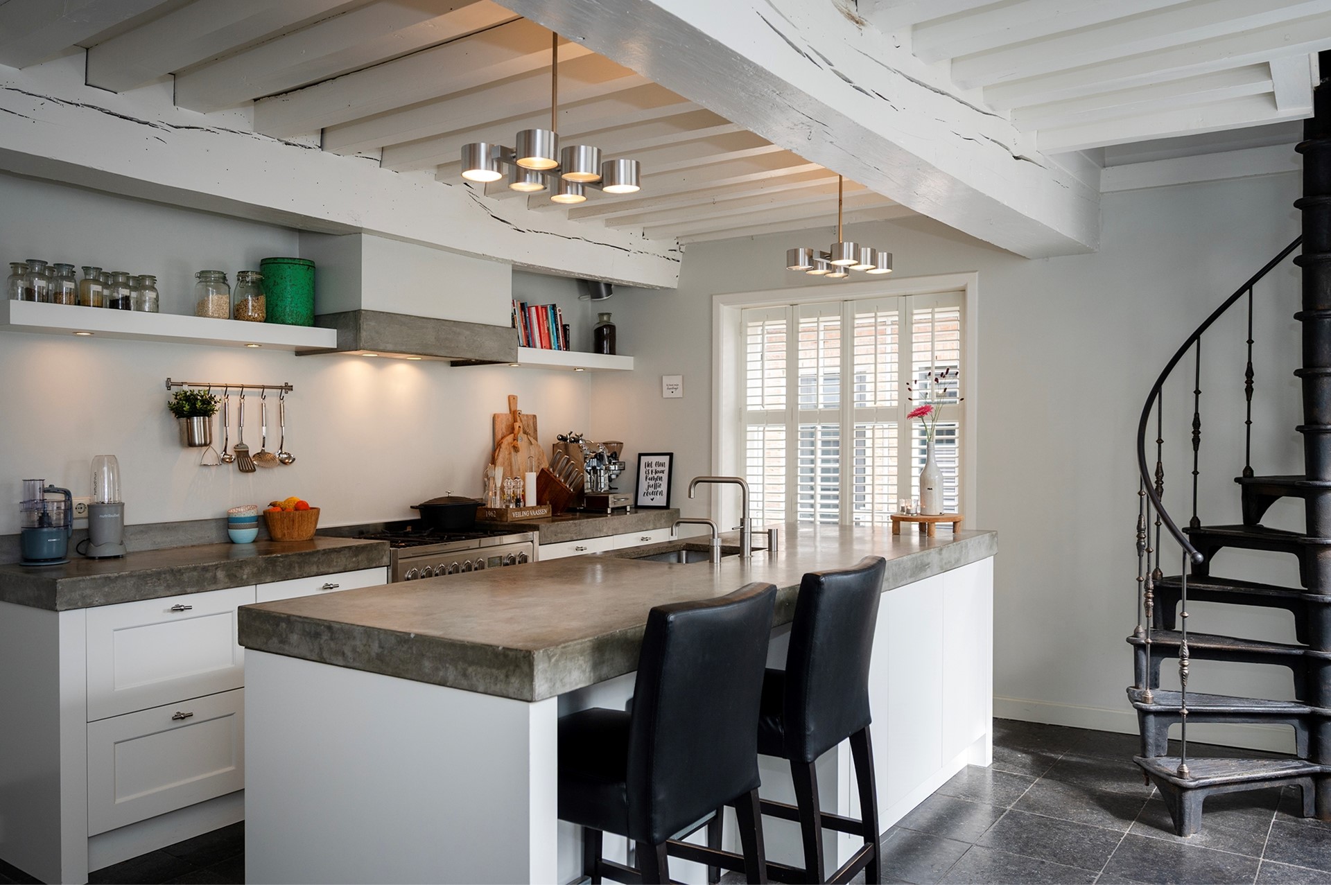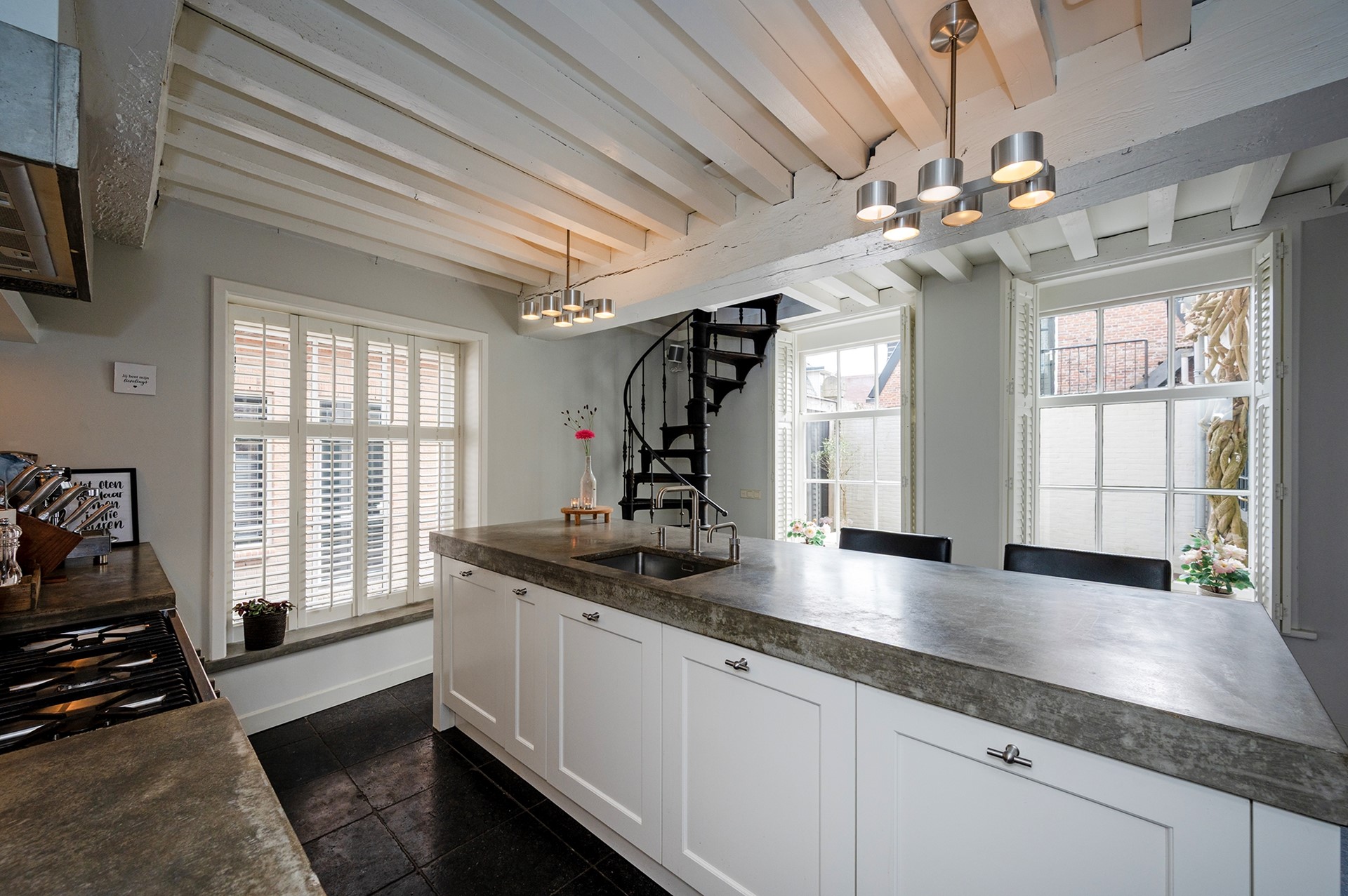 De gehele begane grond is enkele jaren geleden verbouwd; hier vind je na entree de hal met meterkast, een sfeervolle woonkeuken met authentiek balkenplafond en een flinke voorraadkast. De keuken is voorzien van een spoel-/werkeiland, koelkast, vaatwasser, Quooker en een 6-pits gasfornuis met brede oven en afzuigkap. De unieke gietijzeren spiltrap vormt een echte eyecatcher en leidt naar de woonverdieping.