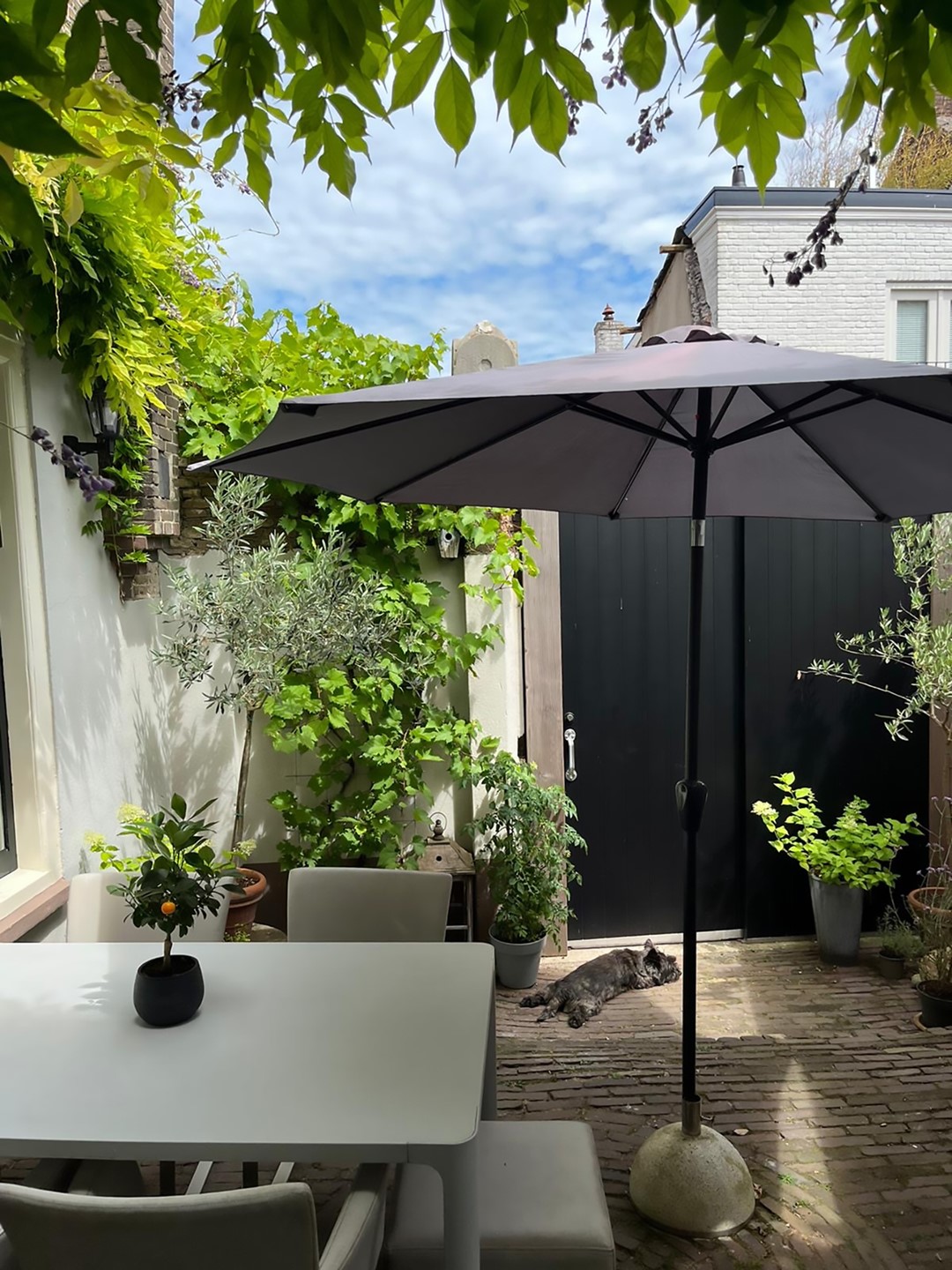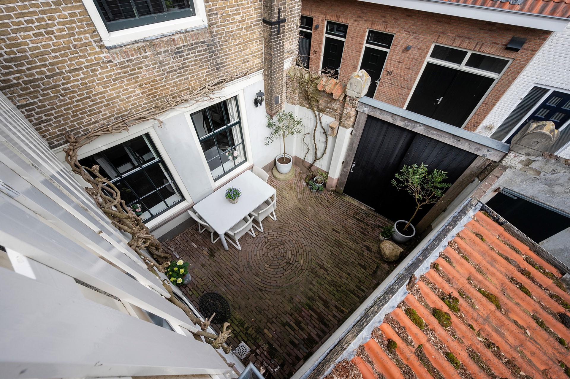 Buiten een heerlijke stadstuin met veel privacy door de hoge gemetselde muur en grote schuifdeur (bijvoorbeeld voor de motorliefhebber). Boven op de muur bevinden zich nog twee ornamenten die afkomstig zijn van de vorige voorgevel van Havenstraat 14.