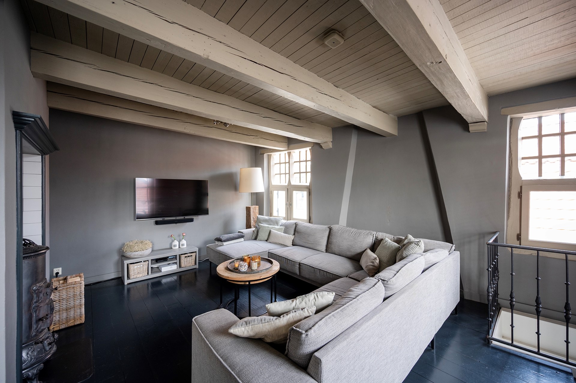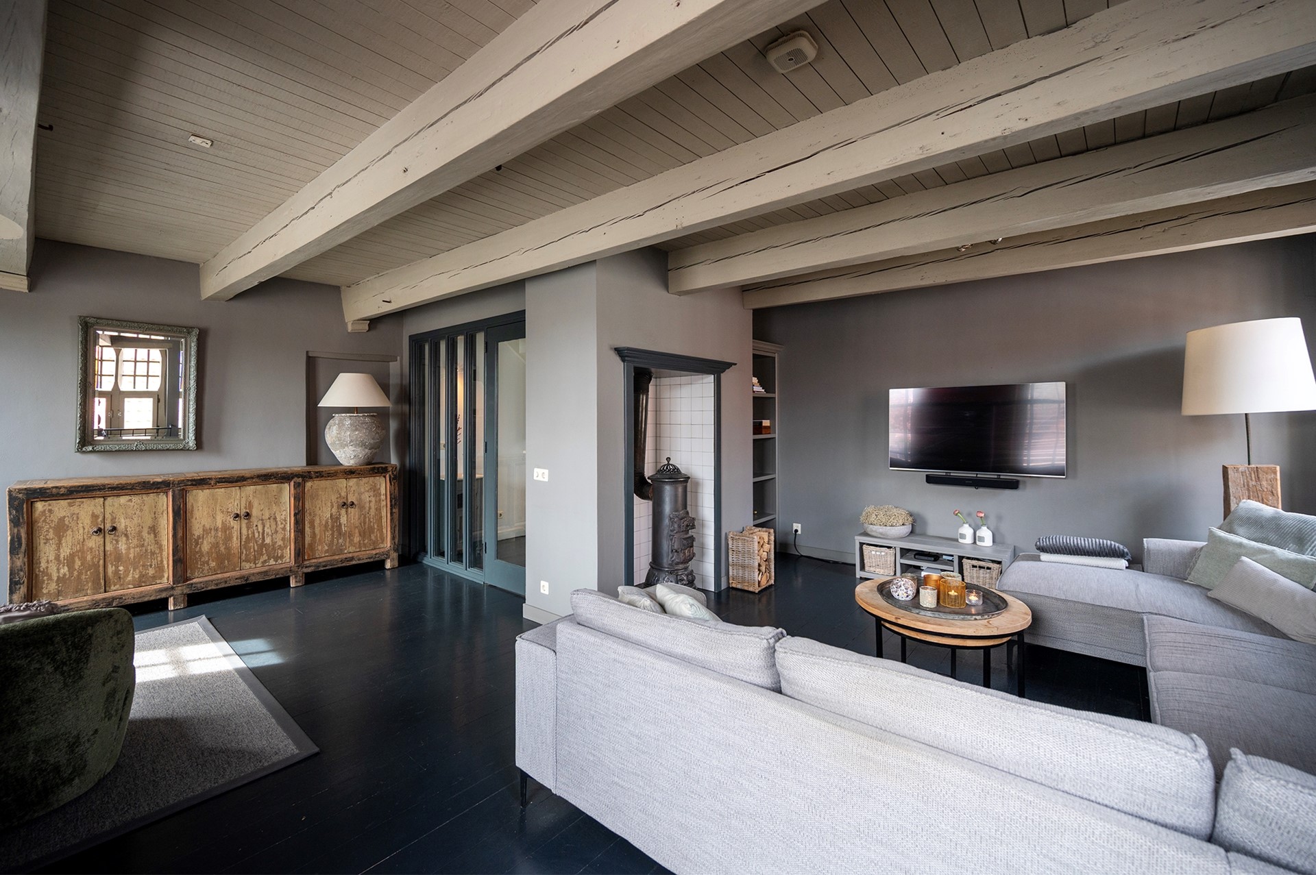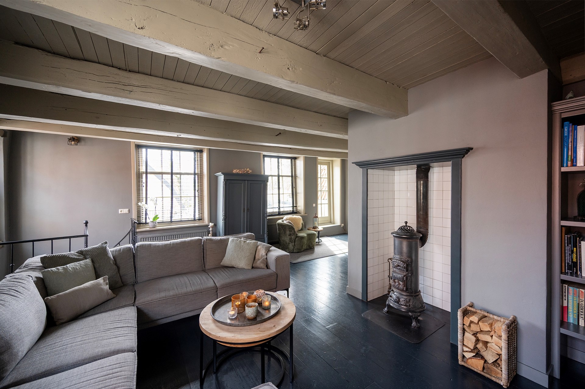 De sfeervolle woonkamer is voorzien van een zitgedeelte met potkachel / allesbrander. De prachtige lichtinval schijnt door de eeuwenoude raampjes met luiken naar binnen. Vanuit de woonkamer stap je zo het royale en zonnige dakterras op, waar je ook in de avond uurtjes heerlijk kunt genieten.