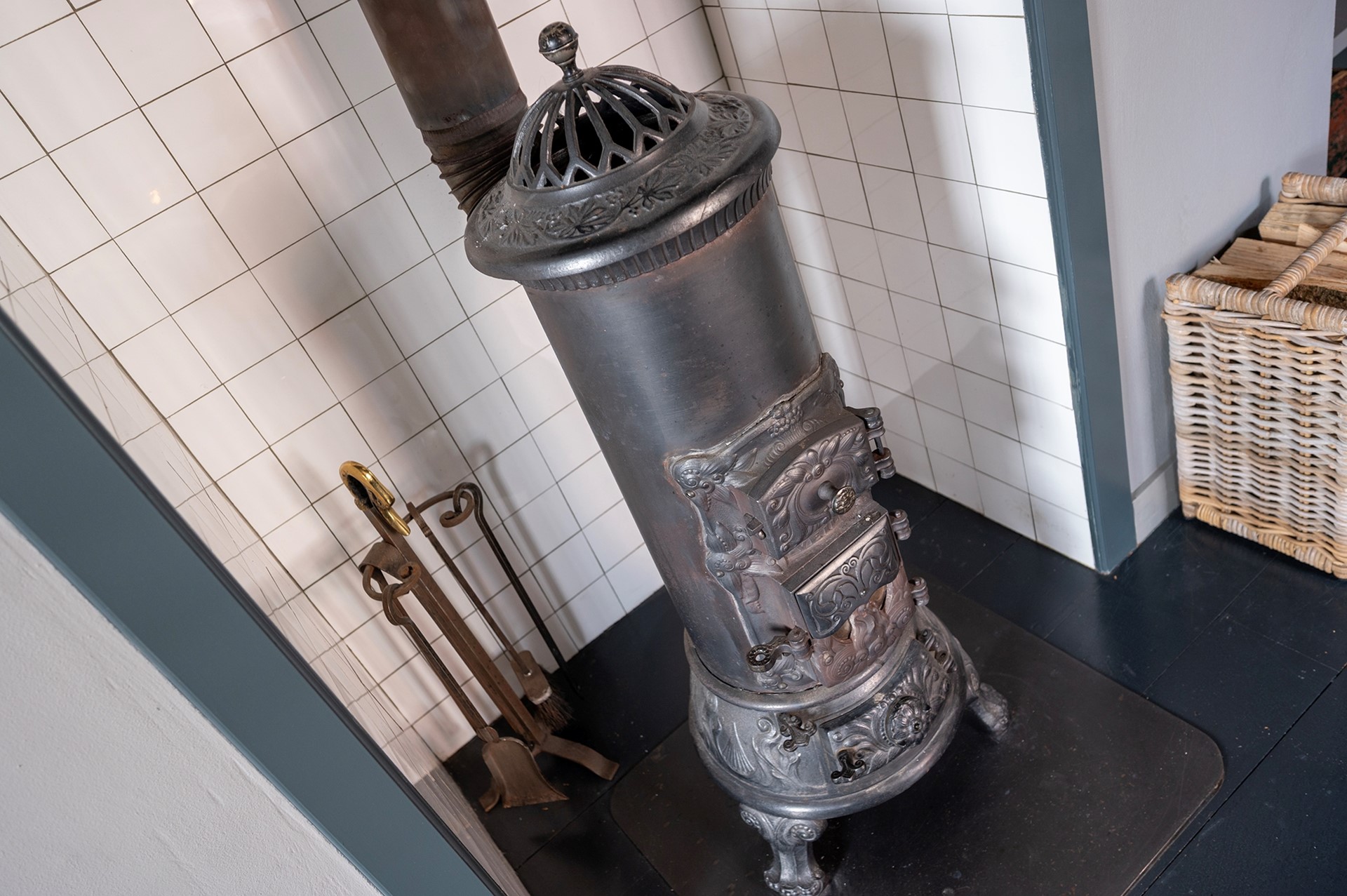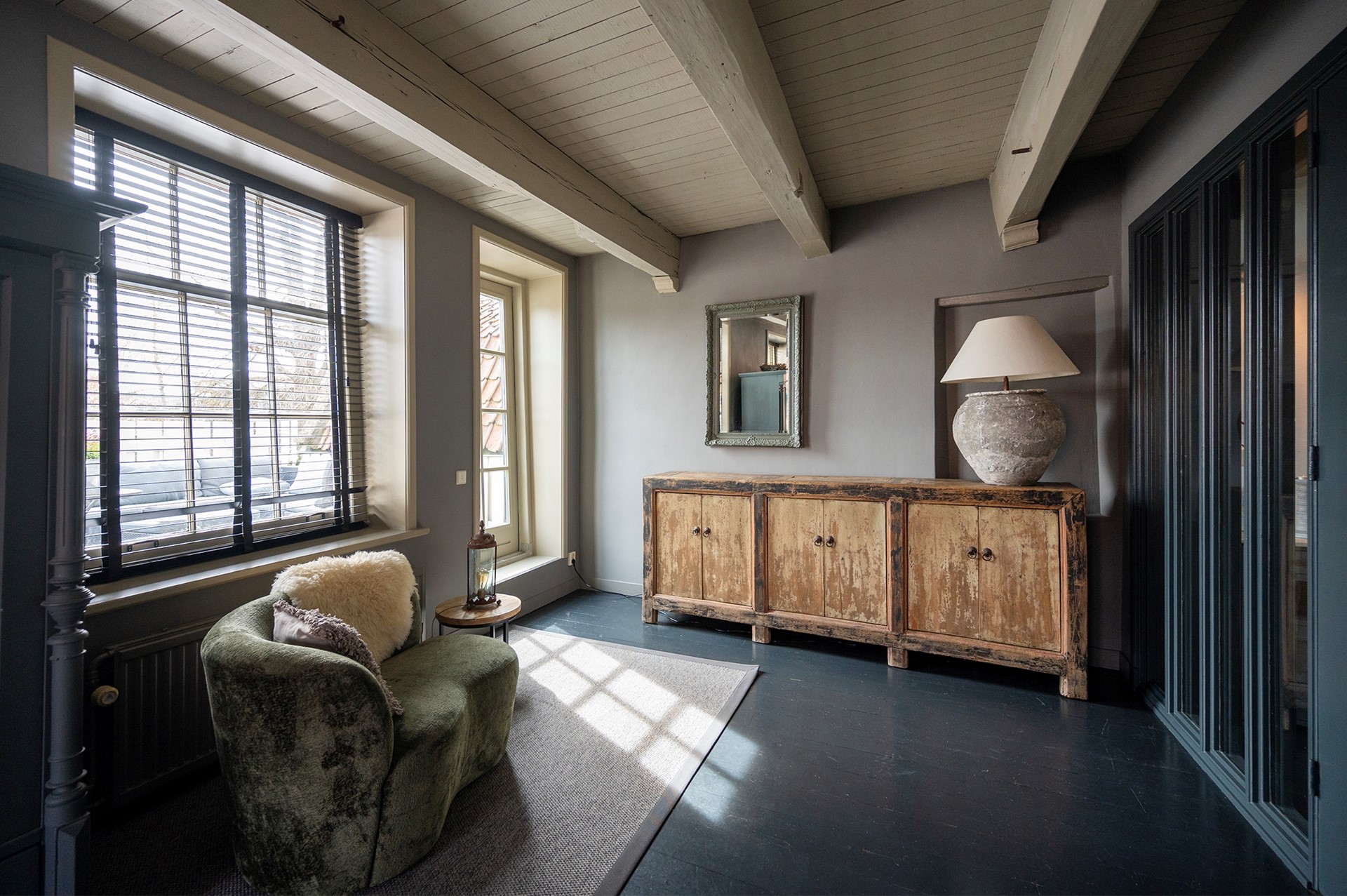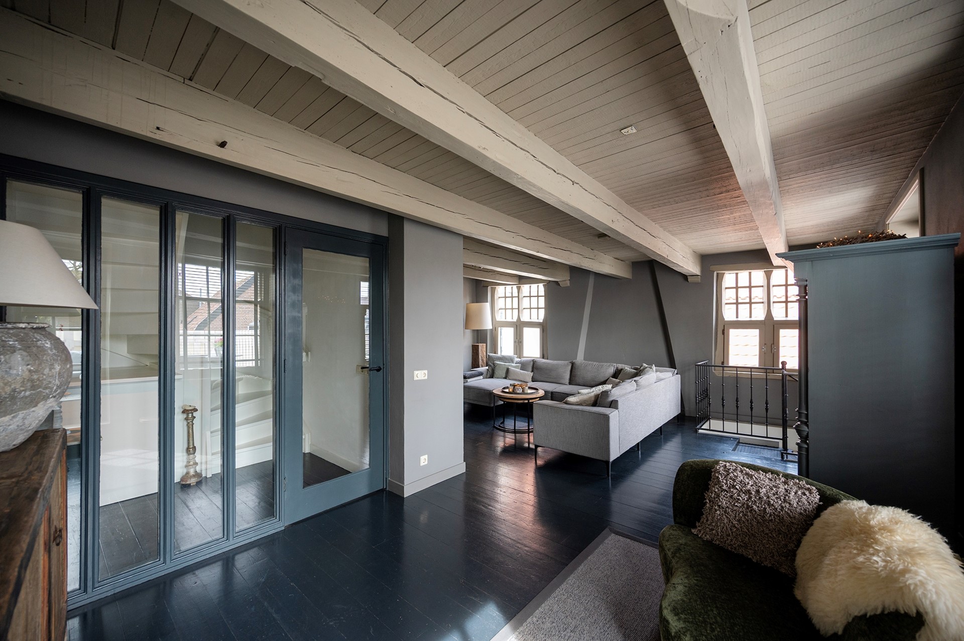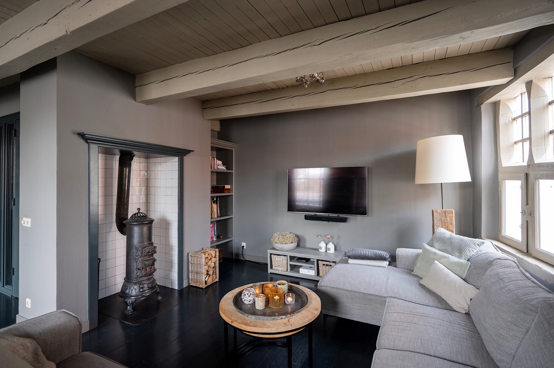 De sfeervolle woonkamer is voorzien van een zitgedeelte met potkachel / allesbrander. De prachtige lichtinval schijnt door de eeuwenoude raampjes met luiken naar binnen. Vanuit de woonkamer stap je zo het royale en zonnige dakterras op, waar je ook in de avond uurtjes heerlijk kunt genieten.