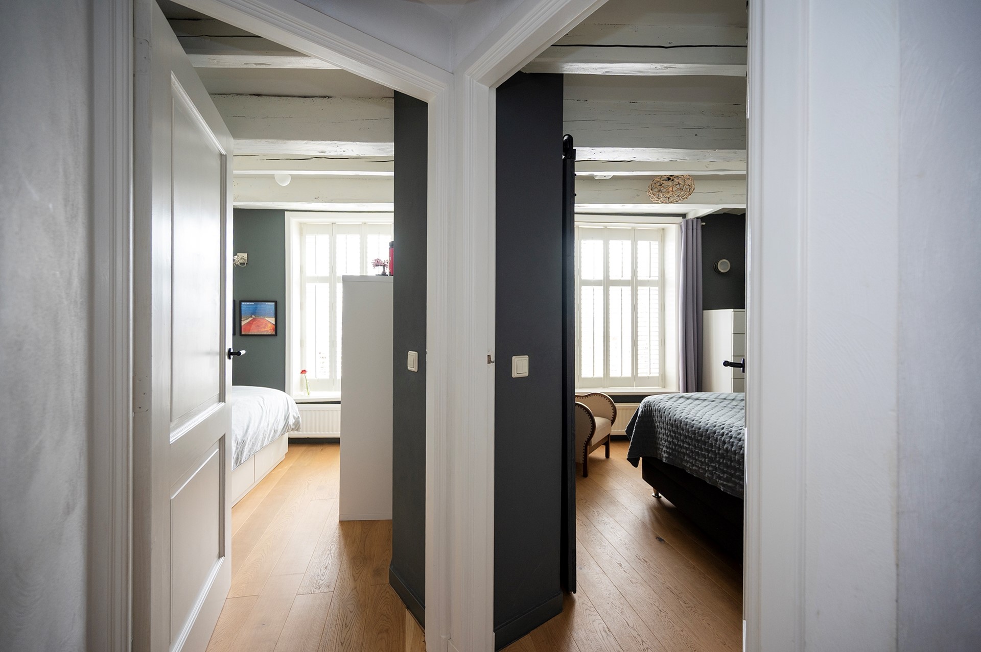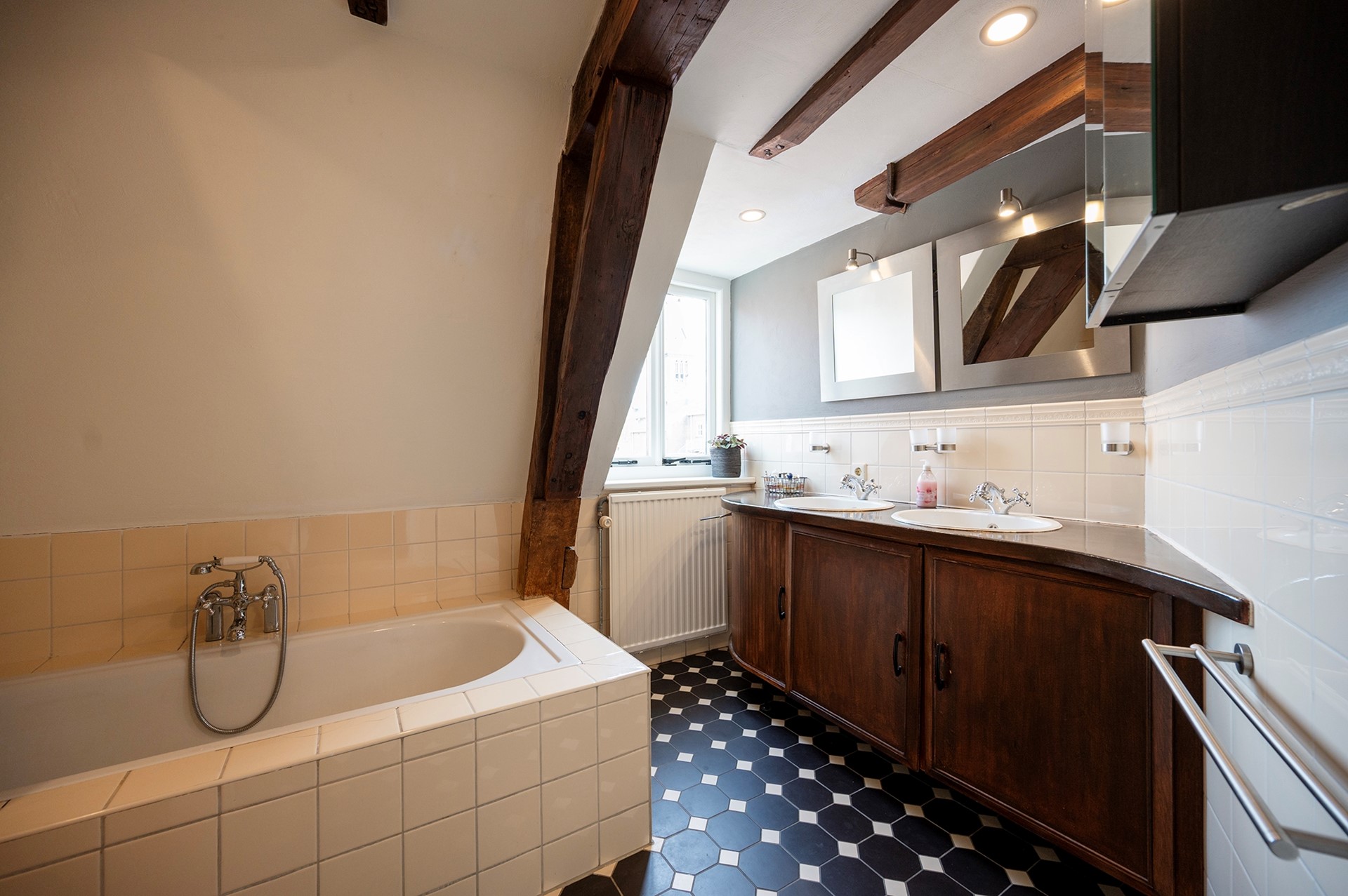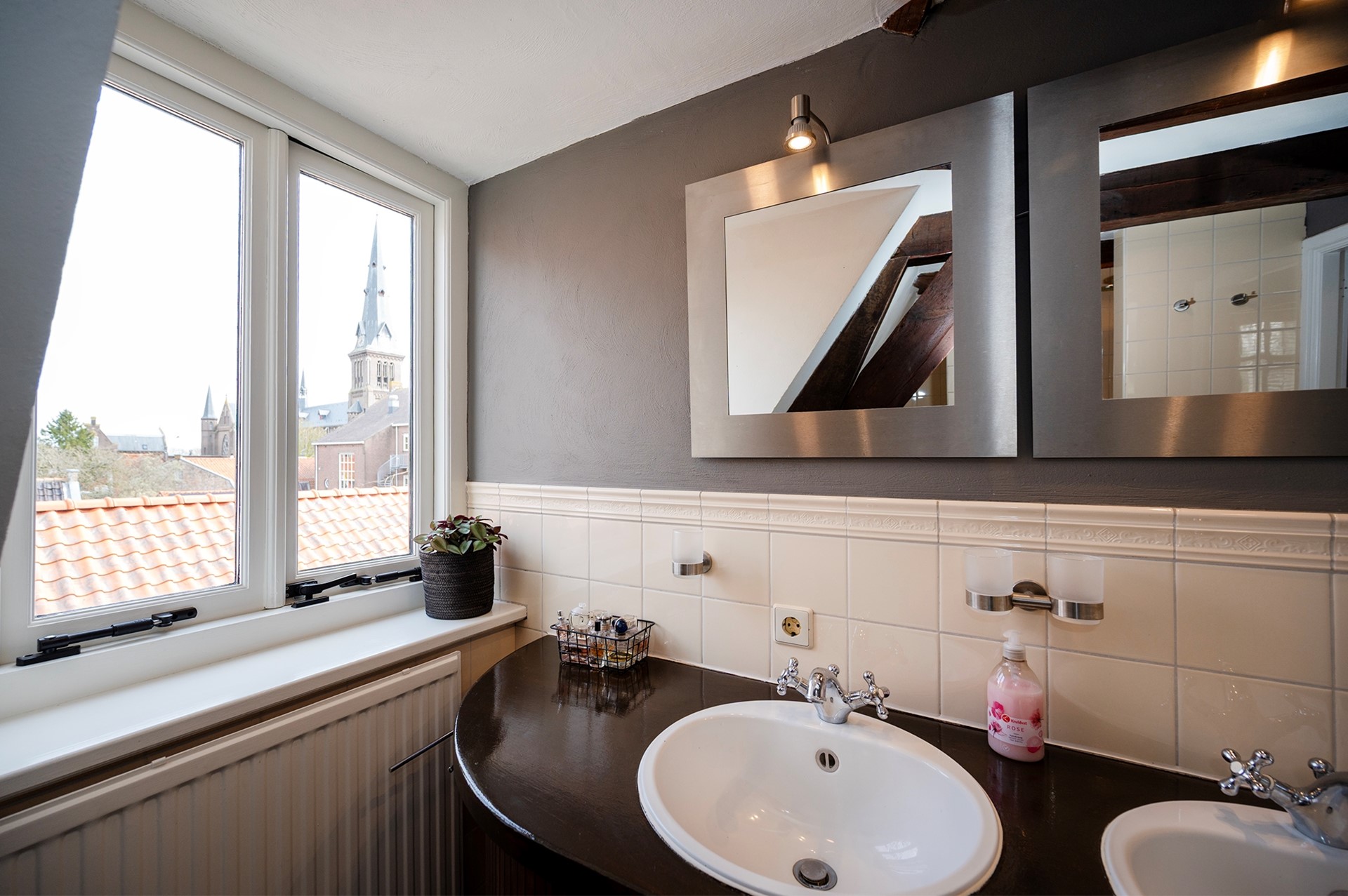 Hier bevinden zich twee slaapkamers, beide met inbouwkasten, en een ruime badkamer met ligbad, inloopdouche, meubel met dubbele wastafel en een fraai uitzicht op de St. Franciscuskerk.